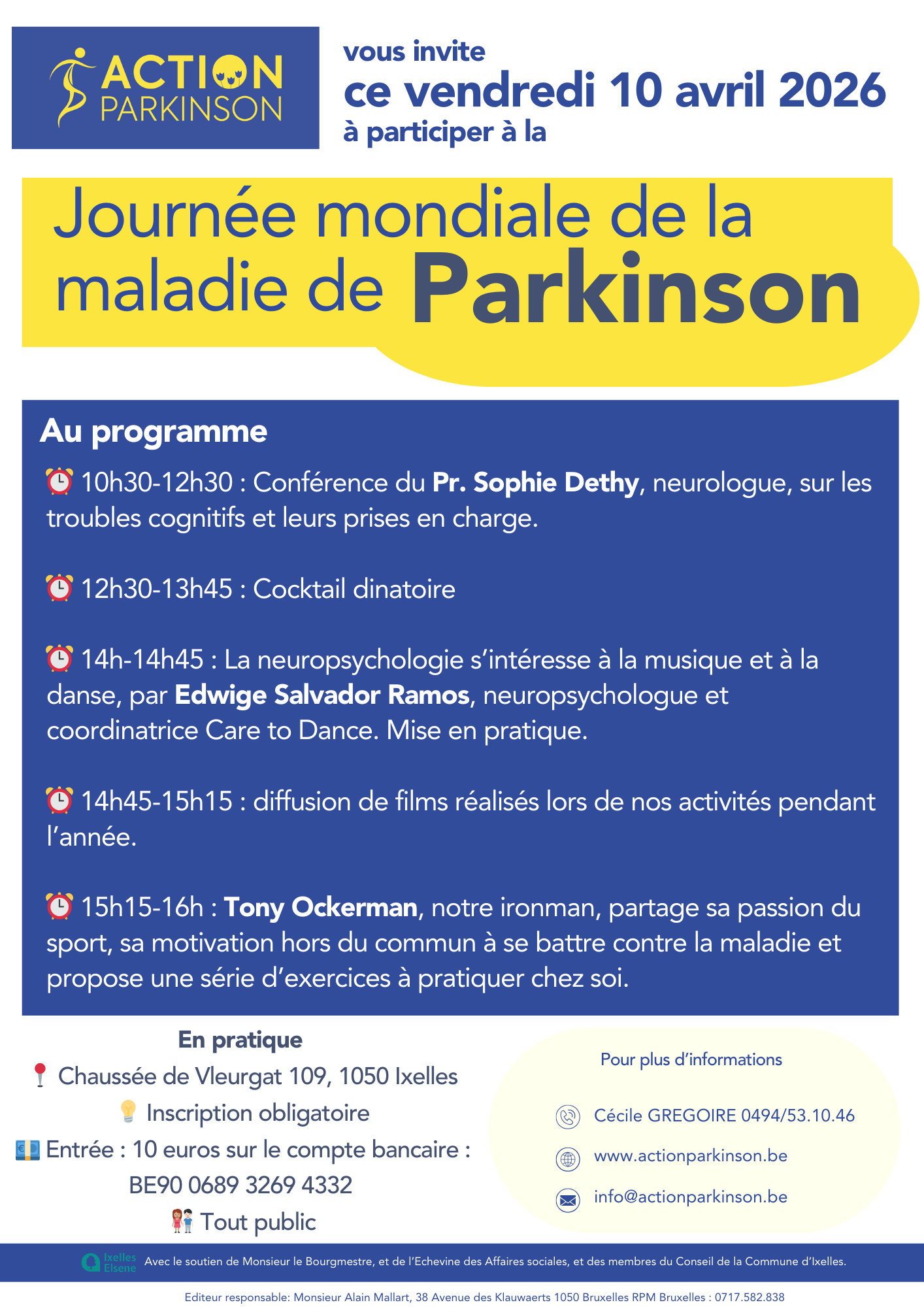 - 10/4 : conférence du Pr. Sophie Dethy, neurologue, sur les troubles cognitifs et leurs prises en charge, lors de la Journée mondiale de la maladie de Parkinson.
